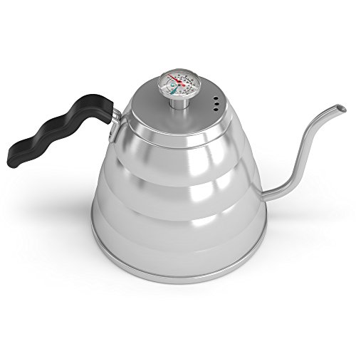 La bouilloire dispose d’un thermomètre intégré. Ce dispositif chauffe l’eau à une température précise afin d’obtenir un café meilleur. Une eau bouillante risque en effet d’éliminer toute la saveur du breuvage. Au contraire, une eau trop froide dénature son goût.