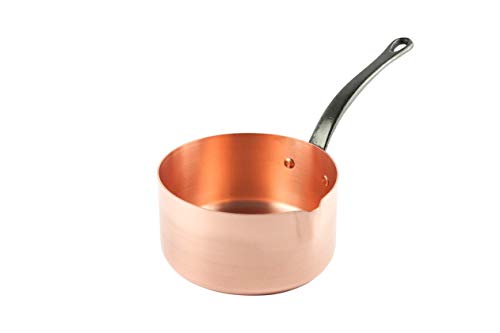 Le design classique de la casserole est complété par un manche en fonte et des rivets en cuivre, assurant une prise stable et résistante. Un bec verseur pratique permet aussi de verser facilement des liquides comme le beurre ou le sucre, ce qui en fait un choix idéal pour la préparation de sauces et de plats sucrés.