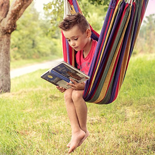 Besoin d’acheter la meilleure chaise hamac pour bien accueillir les beaux jours ? Avec ce modèle, vous n’aurez plus besoin de choisir entre confort et esthétique. En effet, conçu à 100 % en coton, ce mobilier promet une sensation agréable que la peau adore. Sa couleur vive et tonifiante apportera du dynamisme à votre déco.