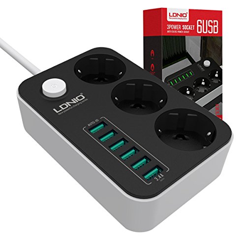Besoin d’un modèle pas cher avec un bouton d’alimentation ? Cette multiprise et parasurtenseur ethernet peut vous intéresser. Son bouton vous permettra de savoir si l’appareil est en marche ou non en un clin d’œil. Constitué de trois prises universelles jack ainsi que de six ports USB, il peut aussi faire office d’un chargeur d’une puissance de 2500 W. Vous pouvez ainsi recourir à ce modèle pour recharger votre iPhone, tablette, Smartphone, ordinateur et tant d’autres encore.