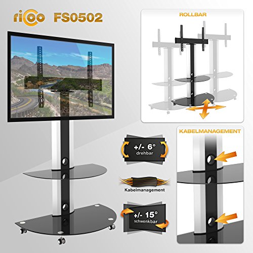 RICOO FS0502 est une table TV de haute qualité. Elle est compatible avec plusieurs tailles de télévision. Le panneau frontal de cette table est orientable de plus ou moins 15 degrés selon vos besoins et votre confort. Ses roulettes sont blocables pour plus de sécurité.