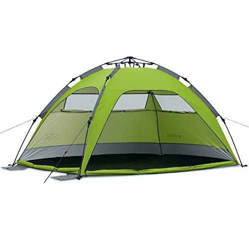 C’est une tente de grande taille qui peut accueillir plusieurs personnes. Grâce à la fermeture éclair, on peut avoir de l’intimité. Son matériel offre une protection contre les UV 80. Le système quick-up permet de la monter rapidement et encore plus rapidement de la ranger.