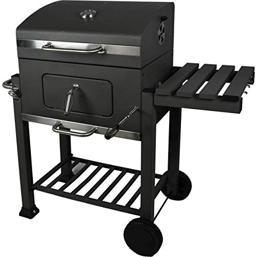 Il embarque une tablette supplémentaire conçue spécialement pour installer les ingrédients ou les ustensiles de cuisine. Vous pouvez d’ailleurs le déplacer facilement puisqu’il est surmonté de deux roues robustes. Ses pieds fixes, quant à eux, gardent le barbecue au charbon de bois stable tout au long de la cuisson. En outre, il arbore un aspect élégant avec ses poignées en acier inoxydable et son coloris sobre.