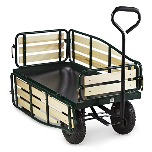 Pour faciliter les chargements, ce chariot intègre des panneaux latéraux qui sont entièrement rabattables. En termes de prise en main, le Waldbeck Ventura est équipé d’une large poignée en métal servant à tracter la carriole, sans oublier les immenses roues qui offriront plus de stabilité sur un terrain bosselé. Accessoirement, ce chariot de transport jardin dispose un rembourrage amovible servant à protéger le chargement, un support à outils et un siège de jardin.