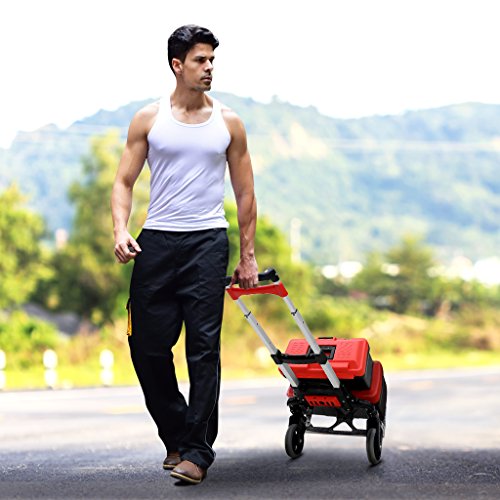 Avec ses deux roues géantes, cet équipement pliable peut se déplacer en toute facilité d’une surface à une autre. Ses autres quatre petites roues, quant à elles, permettent le déplacement horizontal. Elles sont tournantes à 360 °. Vos marchandises seront, de ce fait, protégées de l’humidité liée aux roues de petite taille. Le matériel est doté d’une poignée d’une hauteur réglable à 3 niveaux, dont de 67 cm, 86 cm et 106 cm. Pour ce faire, il vous suffit d’appuyer sur un bouton. Sa stabilité est garantie par ses 3 barres d’armature. Le rangement ne vous posera aucun problème. La machine ne sera pas encombrante tout en étant facile à transporter.