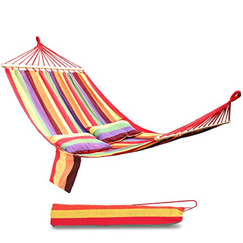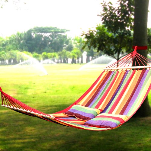 Quel hamac suspendu choisir ? Si vous hésitez encore, vous pouvez tabler sur ce Holifine 185 x 130 cm. Grâce à sa taille, il peut être utilisé par 2 personnes. Il est aussi apprécié des usagers par son design aux couleurs vitaminées.