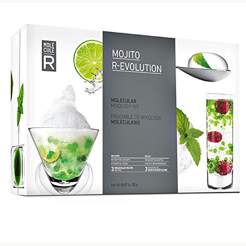 Ce kit vous permet de préparer 3 types de recettes de Mojito moléculaire, dont celle avec du caviar de bulles flottantes, celle avec de la mousse et celle avec une sphère sur une cuillère. Le coffret possède une dimension de 23 x 16 x 7 cm et contient 10 sachets spécialement réservés pour la préparation. Ceux-ci sont constitués de lactate de calcium, de lécithine de soja et d’alginate de sodium. Vous trouverez également dans le coffret une moule en silicone, une cuillère avec perforations, deux pipettes ainsi qu’un livre de recettes.