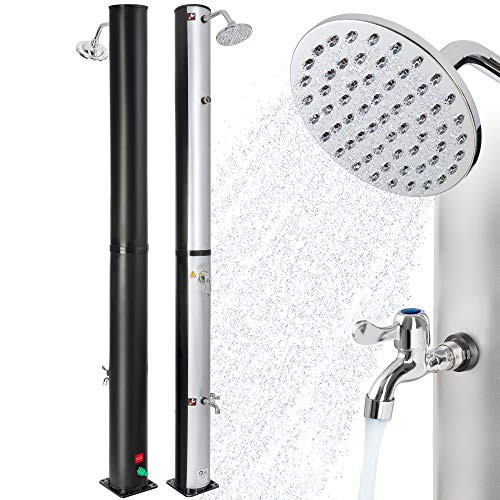 Plus une douche solaire est complète dans ses options, plus elle vous sera pratique. Ce modèle de chez Arebos veut justement sortir du lot en proposant un design élégant, qui ne peinera pas à s’harmoniser avec votre extérieur. Mais plus encore, il s’équipe d’un réservoir de 37 litres qui lui permet de fournir de l’eau chaude en quantité suffisante. Le matériau utilisé est explicitement du PVC résistant pour que les rayons UV n’aient aucun effet sur sa durabilité.