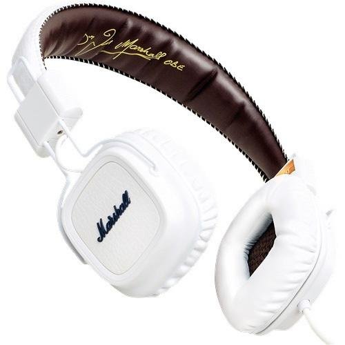 Si vous êtes en quête d’écouteurs Marshall pas chers, ce modèle Major M-ACCS-00120 pourra vous intéresser. Ce casque stéréo arbore un design beaucoup plus travaillé avec son revêtement en cuir blanc martelé à l’extérieur et marron à l’intérieur de l’arceau ajustable, avec un détail de couture doré.