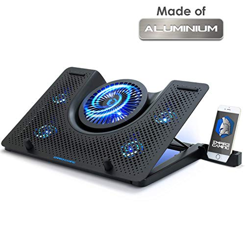 Dans cette catégorie, ce modèle d’EMPIRE GAMING se démarque par son système TURBOOST. Celui-ci abaisse efficacement la température du PC afin d’en optimiser les performances et d’en augmenter la durée de vie. Ce support est formé de 5 ventilateurs (1 de 14 cm et 4 de 6 cm chacun), d’un tuyau d’extraction d’air chaud et d’un plateau alvéolé (1032 orifices en tout). De facture solide, il est fait d’aluminium teinté et de plastique ABS. Sur le plan design, il est équipé de divers éléments de sécurité dont une base antidérapante, 2 patins siliconés et un buté antichute. Il est aussi doté d’un rétro-éclairage LED bleu.